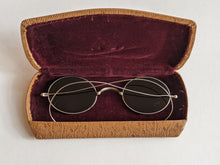 Silver tone frames with dark grey glass lenses. Includes light brown case with burgundy velvet lining.