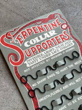 Fantastic deadstock 1910s collar supporters with the most incredible artwork! Red serpents frame the cards and the text reads: