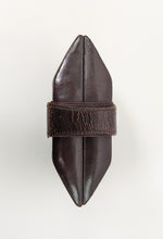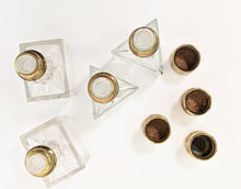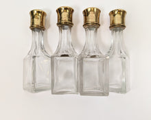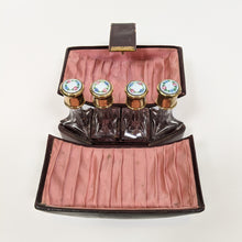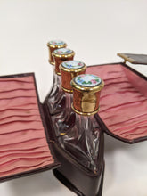 These four bottles come in two different shapes - two have rectangular bases and two have triangular bases. They fit snugly into a custom leather travel case with a brass clasp.