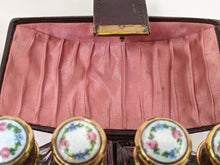 Truly exceptional perfume bottle set with case circa 1910s. It features four glass perfume bottles with glass stoppers and screw top lids with guilloche enamel floral designs on the top.