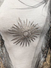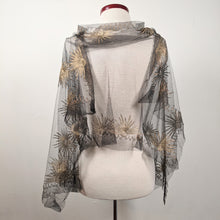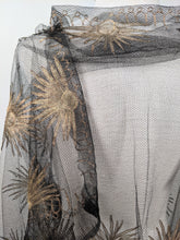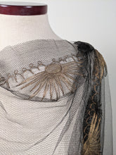 Circa 1920s, this exquisite net lace shawl features beautiful metallic gold embroidery in a sun motif.