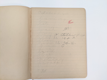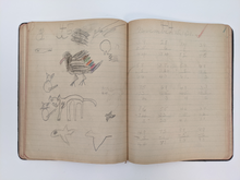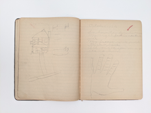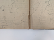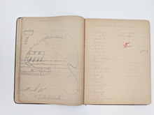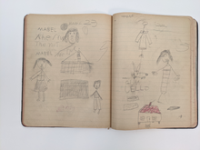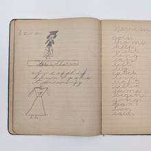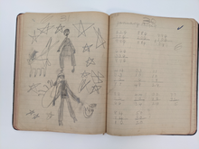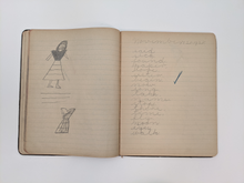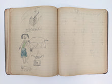 Adorable child's notebook from the 1920s filled with schoolwork and creative drawings.