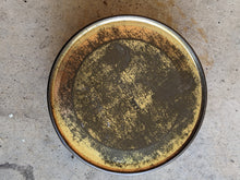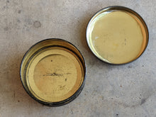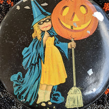 Adorable Halloween candy tin circa 1930s by Tindeco depicting a little girl dressed as a witch holding a broom and a large jack-o'-lantern.