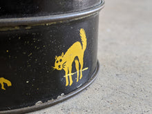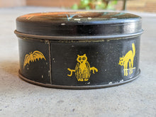 On the sides of the tin are little illustrations of a cat, owl, witch, and bat.
