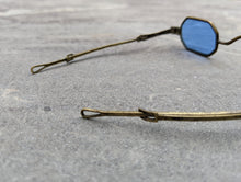 These gorgeous blue tinted eyeglasses date from between 1835-1880. They have brass frames with extending arms ("loop slide" side arms) and octagonal lenses.