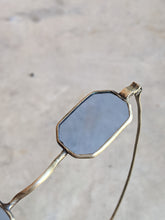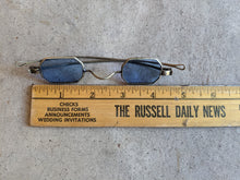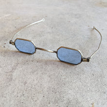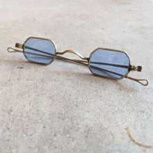 These gorgeous blue tinted eyeglasses date from between 1835-1880. They have brass frames and octagonal lenses. The glass lenses are tinted blue but have no prescription (just clear, tinted glass).