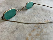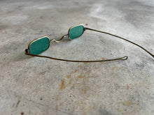 These gorgeous green tinted eyeglasses date from between 1835-1880. They have brass frames and octagonal lenses. The glass lenses are tinted green but have no prescription or magnification