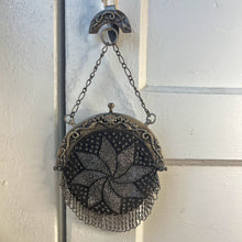 The cut steel beading on the purse front forms the shape of a star, and twisted cut steel beaded fringe trims the bottom edge of the circular bag.