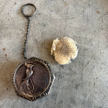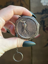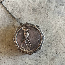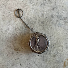 Lovely silver plated finger chain or chatelaine compact with a bird design and octagonal shape circa 1920s-1930s.