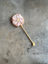 Ribbon wrapped handle and pink rosette on the the back of the puff.