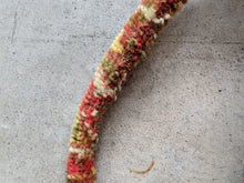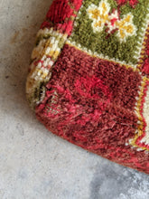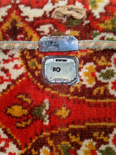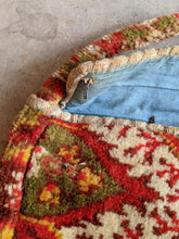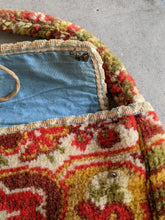Made from a wool carpet remnant, this would have been a travel bag. This is a medium-sized carpet bag and probably would have been used for a day trip. You could easily fit a book and a few snacks.