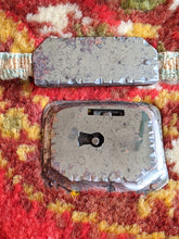Good condition overall, sturdy and usable with care. The main clasp is broken but there are two hook and eye closures.