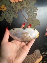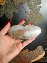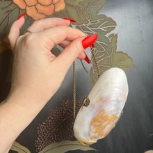 This exquisite turn of the century shell purse has a stunning red leather interior, hangs on a brass chain, and features detailed brass findings--an ornate clasp and brass hinge.