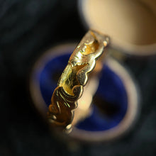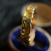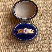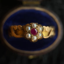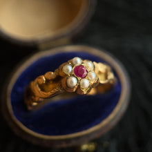 This incredible 15k gold pearl and ruby ring dates from 1862 and has a very unique band! The outside is very ornately decorated and the inside is hollow with little openings all around! It was designed to house a small piece of plaited hairwork from a loved one.