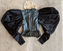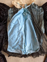 Sleeves are in black silk, while the bodice is a robin's egg blue silk covered with a thin black and gold silk gauze.