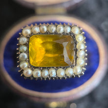A beautiful marriage of two 19th century pieces. The beautiful citrine paste stone surrounded by seed pearls and set into 15k gold was a Georgian era / early 19th century small lace pin. This has been affixed to a later 19th century 18k gold band engraved inside with the name Mary.