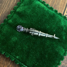 Shaped like a scepter with a faceted amethyst at the top and set with jasper, bloodstone, and two faceted quartz rock crystal stones.