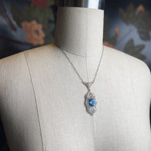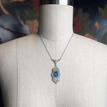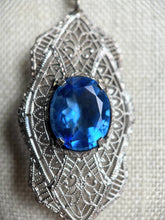 Gorgeous, classic Art Deco filigree necklace in rhodium plated sterling silver circa 1930s. It feature a beautiful deep blue cut glass stone.