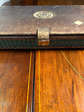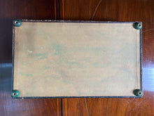 The box itself is leather with a green silk interior and wooden feet. It has some wear but the silk interior is quite good despite a bit of dust. The color is fabulous!