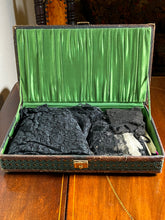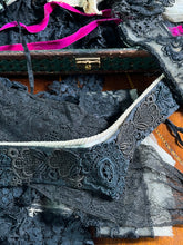 A treasure box full of antique lace scraps, including an Edwardian lace collar, a piece of a mid-19th century lace glove, silk velvet ribbon, and much more.