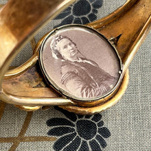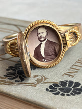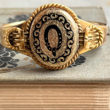 Circa mid-19th century, around 1850s-1860s, it is gold filled with beautiful, intricate black enamel decoration. It is a hinged cuff bracelet with a locket that opens to reveal a portrait of a man. On the inside of the bracelet is a glass covered locket photo of a woman.
