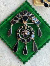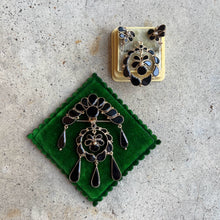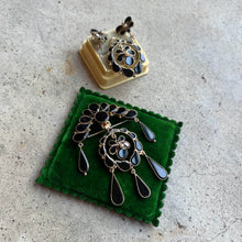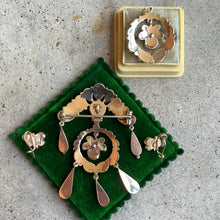 The set features a large, ornate brooch, a pendant, and earrings. The brooch is the real showstopper, with a tiered design that trembles when you move.