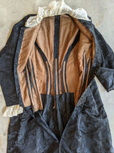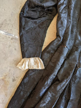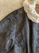 A one piece dress, often called a wrapper dress, this would have been worn at home, yet it is quite elegant. The beautiful damask silk fabric features intricate floral designs, and the collar and cuffs are a lovely, delicate lace with a leaf and vine motif.