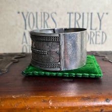 Beautiful Victorian era silver wide cuff bracelet circa 1880s with engraved leaves pattern, very much in the Aesthetic Movement style.