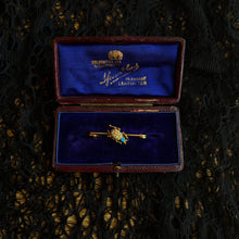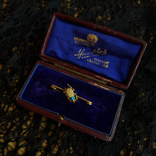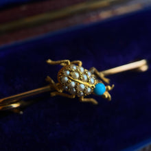 A magical little beetle pin circa the turn of the century, 1890s-1900s, fashioned in 14k gold and set with seed pearls and turquoise.