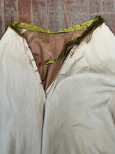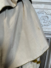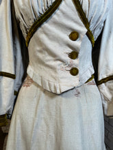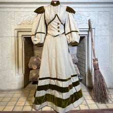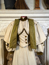 The dress consists of a bodice, skirt, and capelet, cream with olive green velvet trim and accents.