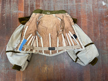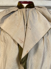 The capelet has hook and eye closures at the collar and is lined with olive green silk to match the olive green velvet trim.
