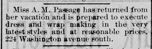I was able to find a mention of Miss A.M. Passage, modiste, in 1890 and 1892 newspaper advertisements, both from the Lansing State Journal. I have included these clippings in the photos (these are digital "clippings" and are not included with the dress).