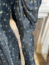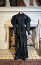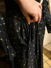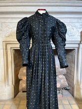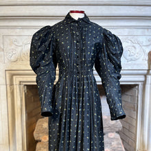 Very sweet cotton wrapper dress circa 1890s with gigot sleeves! The dark blue fabric is very soft with a pattern of little yellow flowers.