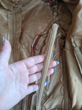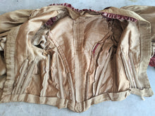Bodice is lined with brown cotton and boned. The sleeves are lined with a sweet floral printed cotton. Hook and eye closures have been removed.