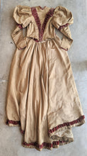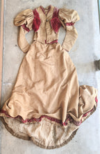 Beautiful gold silk dress circa 1890s with burgundy velvet trim.