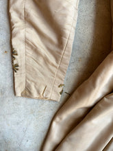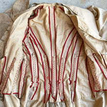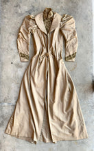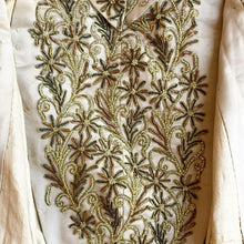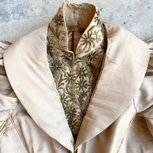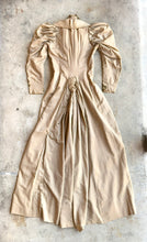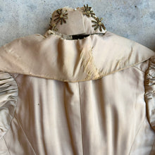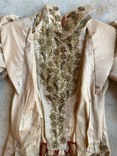 Lovely puffed sleeves with beaded cuffs. A wonderful beaded panel decorates the front of the bodice. Hook and eye closures down the center front beneath the panel, which closes with more hooks and eyes at the side.