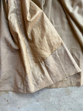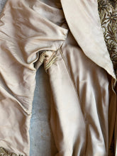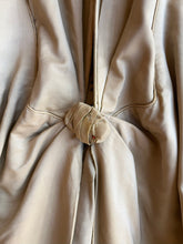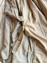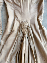Elegant, creamy coffee colored silk tea gown circa 1890s, designed for lounging around the house in luxury and style.