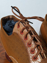 Fabulous and fancy, these circa 1890s oxfords are a beautiful light brown with silk uppers and extreme pointed toe with diamond stitched pattern.