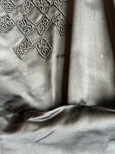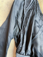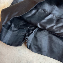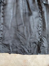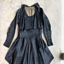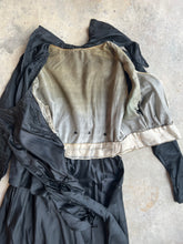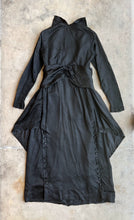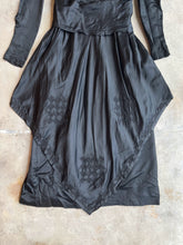 A very witchy 19-teens black silk dress, best for study or display. Love the shape, the pointed collar and skirt panel.