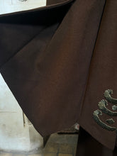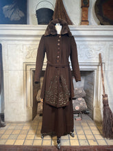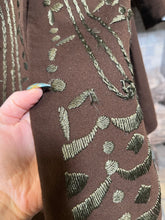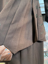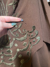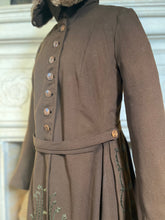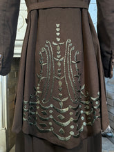 Beautiful brown wool ladies' suit consisting of a jacket with fur collar and lovely green embroidery, and a skirt (with pockets!), circa 19-teens, likely between 1915-1918.