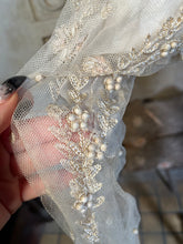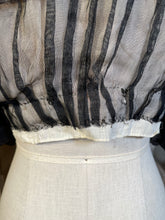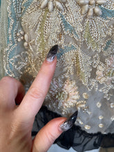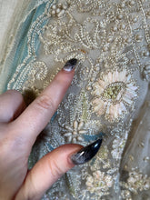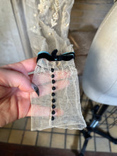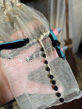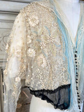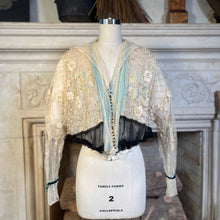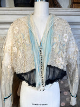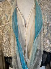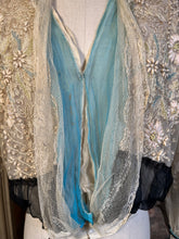 Multiple layers of light, airy lace and silk, create a beautiful mix of textures. The base layer of net lace has hook and eye closures. Over that is a cream silk layer, then a robin's egg blue tissue silk layer, and the final layer of lace with tiny snaps and decorative black buttons.