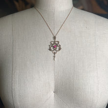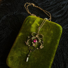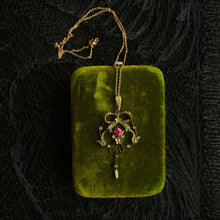 I adore everything about this piece, from the glowing ruby stone, to the "ribbon" bow motif, to the tiny forget me not flowers. Delicate seed pearls decorate the pendant and a larger baroque pearl tips the drop.