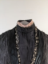 Adorable silk taffeta bodice circa 1900s with a net lace overlay. Cuffs and waistband are twisted black and pink velvet. Black and pink velvet collar.