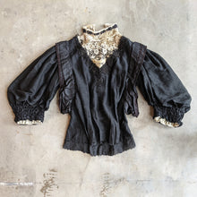 Lovely black cotton/silk Swiss dot shirtwaist circa 1900s with beautiful puffed sleeves and lace collar.