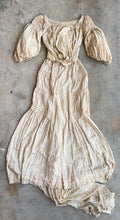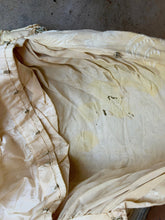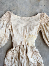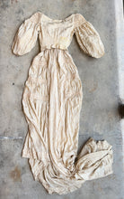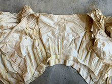 Best for study or display. Some stains and holes, namely on the front and back of the bodice and underarms. The bodice lining is shattering. The silk that makes up the bodice and skirt is thin but not shattering.