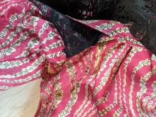 Stunning bright pink silk dress with black lace circa 1905-1907. I just love the vibrant colors and interesting pattern, as well as the contrasting black lace on the bodice and skirt. The balloon sleeves are three quarter length with more fitted cuffs.