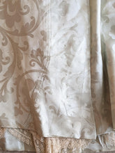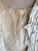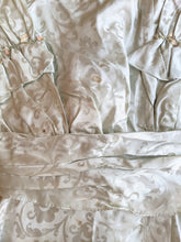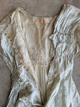 This beautiful silk gown is a tragic beauty. Circa 1910, she is a lovely shade of seafoam green silk with a lace lining and little silk ribbon flowers trimming the neckline.