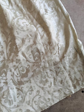 Attached belt fastens with hooks and bars at the center back. Snaps and hefty hook and eye closures down the side front fasten the net lace lining and outer silk dress.