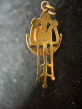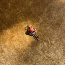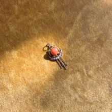 Lovely 10k gold pendant circa 1910s with a coral cabochon and seed pearls set into a crescent moon.