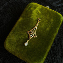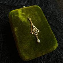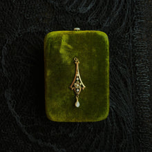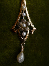 A very sweet 10k gold lavalier pendant featuring a lovely forget me not of pearls and a baroque pearl drop. Circa 1910s.